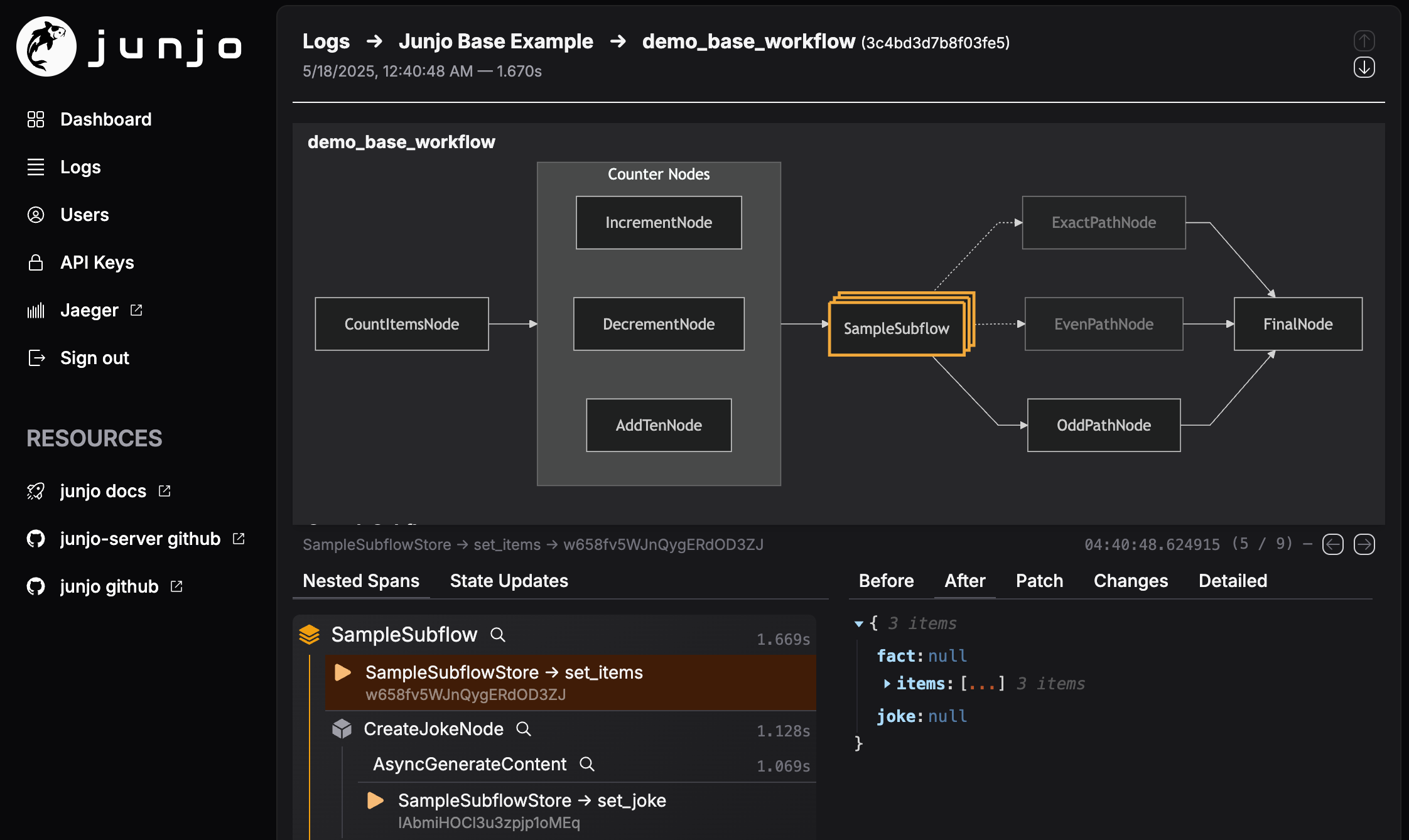 The above screenshot shows the telemetry visualization of this getting started example. Visually step through the workflow nodes and individual state updates.